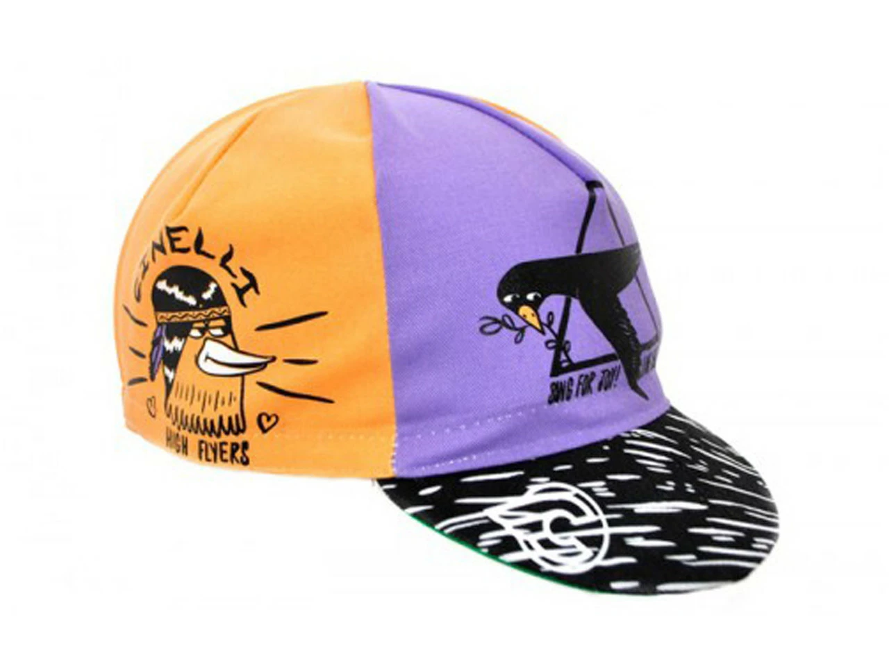 Die High Flyers Radmütze von Cinelli wurde in Zusammenarbeit mit dem englischen Zeichner Stevie Gee entworfen. Vogelzeichnungen auf lila-orange Grundierung.